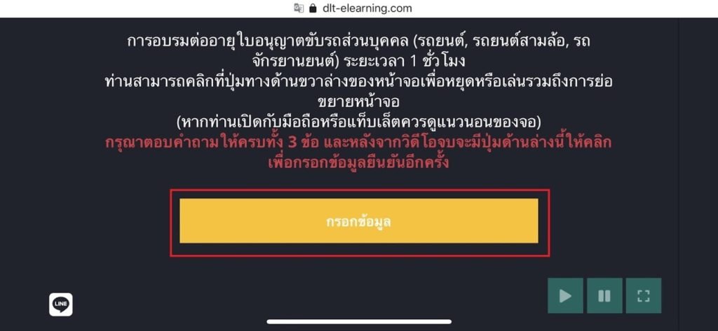 6. ระบบจะนำเข้าสู่การชมวิดีโออบรม ให้อ่านเงื่อนไขของการชมวิดีโอ “กรุณาตอบคำถามให้ครบทั้ง 3 ข้อ และหลังจากวิดีโอจบ จะมีปุ่มด้านล่างนี้ให้คลิกเพื่อกรอกข้อมูลยืนยันอีกครั้ง”