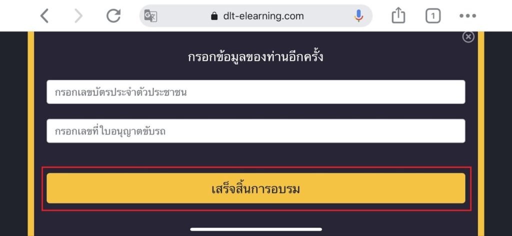 13. กรอกข้อมูลเลขบัตรประจำตัวประชาชน และเลขที่ใบอนุญาตขับรถ แล้วกดปุ่ม “เสร็จสิ้นการอบรม”