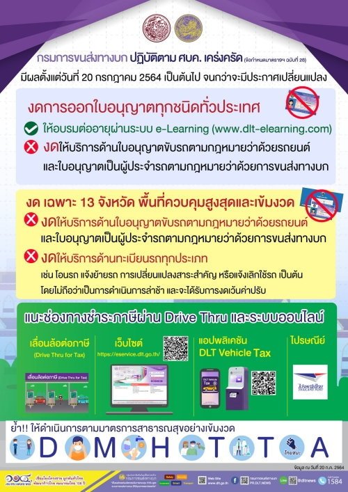 งดให้บริการด้านใบอนุญาตขับรถตามกฎหมายว่าด้วยรถยนต์ และใบอนุญาตเป็นผู้ประจำรถตามกฎหมายว่าด้วยการขนส่งทางบก ณ สำนักงานขนส่งทุกแห่งทั่วประเทศ ตั้งแต่วันที่ 20 กรกฎาคม 2564 เป็นต้นไป จนกว่าจะมีประกาศเป็นอย่างอื่นหรือยกเลิกสถานการณ์ฉุกเฉิน