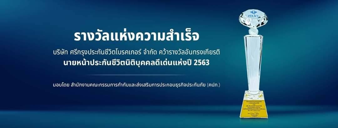 บริษัท ศรีกรุงประกันชีวิตโบรคเกอร์ จำก้ด คว้ารางวัลอันทรงเกียรติ นายหน้าประกันชีวิตนิติบุคคลดีเด่น ประจำปี 2563 ซึ่งมอบโดย สำนักงานคณะกรรมการกำกับและส่งเสริมการประกอบธุรกิจประกันภัย (คปภ.)