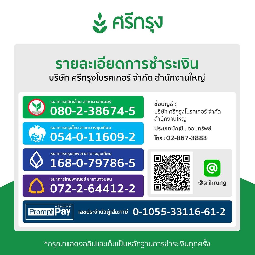 12.มีช่องทางการชำระเงินค่าเบี้ยประกันทุกรูปแบบ ทั้งโอนเข้าศรีกรุงโบรคเกอร์หรือโอนเข้าบริษัทประกันภัย