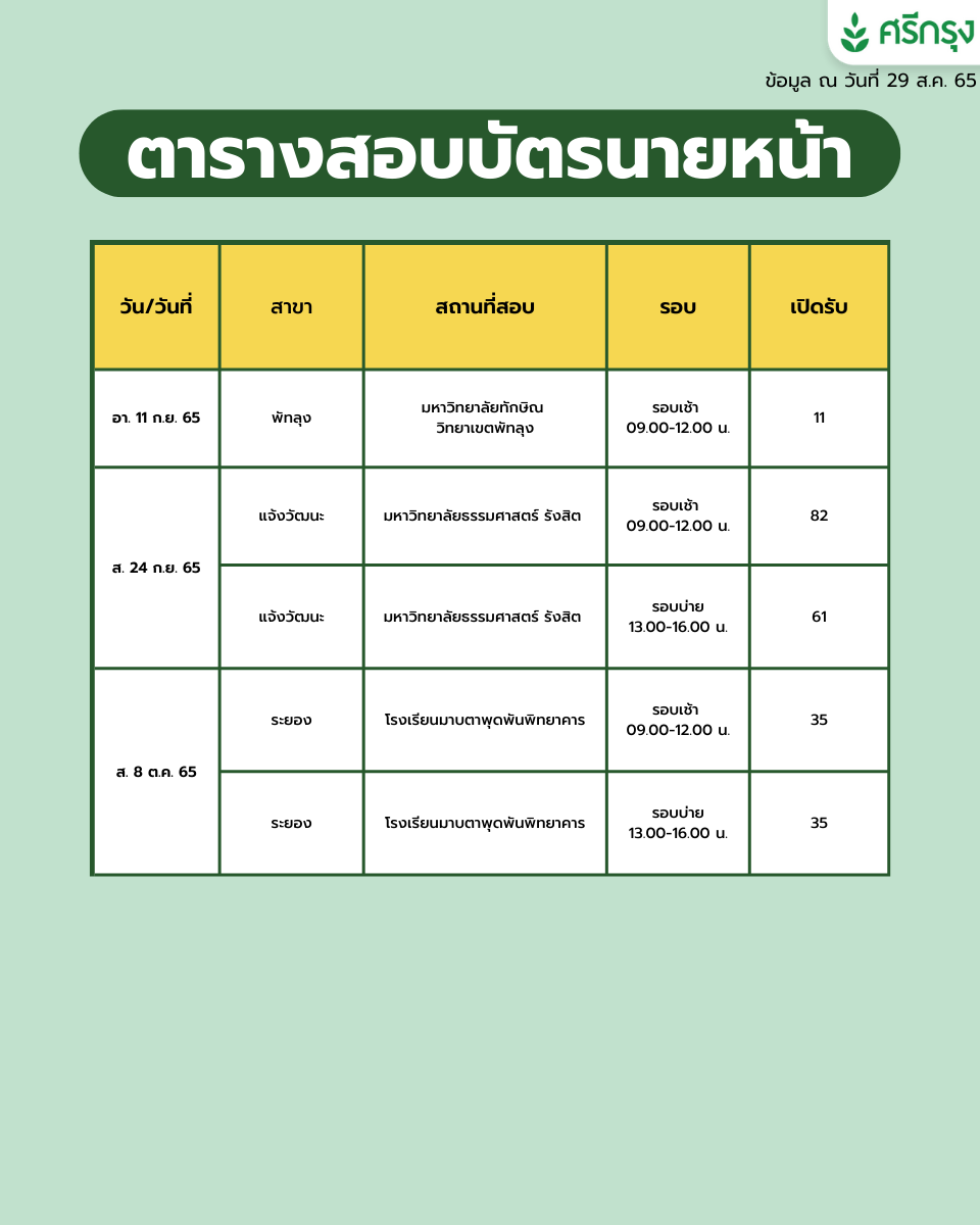 ศรีกรุงโบรคเกอร์ สาขาบางบอน เปิดรับสมัครสอบบัตรนายหน้าประกันวินาศภัย รอบพิเศษ