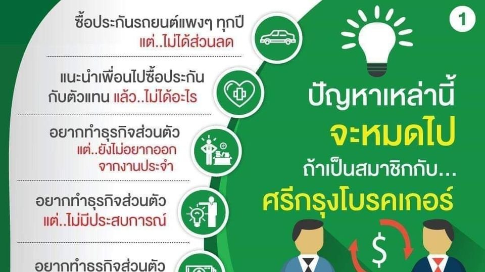 Srikrung Broker รับ สมัครนายหน้าประกันรถยนต์ พ.ร.บ. ประกันภัยครบวงจร เริ่มต้นง่าย เพียงสมัครสมาชิก 200 บาท ได้รับประกันอุบัติเหตุทุน 100,000 บาท สามารถเริ่มธุรกิจได้ทันที มีรายได้หลายช่องทาง เมื่อสมัครและมีรหัสสมาชิกแล้ว สามารถซื้อประกันในราคาสมาชิก ทั้งของตนเองและบุคคลในครอบครัว แนะนำคนซื้อประกันในราคาสมาชิก รับค่าแนะนำ ต่อยอดสร้างรายได้ มีใบอนุญาต(เรามีอบรมติวสอบ แนวข้อสอบ คลิปติวสอบให้ฟรี) สามารถขายรับค่าคอมมิสชั่น หรือ ขยายทีมงานรับค่าบริหาร ตามแผนการตลาด MGM