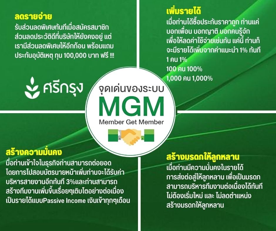 ความสําเร็จของธุรกิจ MGM คือ ทุกคนสามารถเลียนแบบได้ สาหรับคนที่ชอบแบรน่า บอกต่อ ไม่บังคับ) รับรองรวยง่ายๆ มี รายได้หลักแสนต่อเดือนโดยไม่ต้องลงทุน สร้างรายใต้ ทีเป็น Passive income หยุดท่างานแต่ยังมีรายได้ โอนอ่อ ทายาทเป็น มรดกต่อไปได้กับสินค้า แนะน่าง่าย ทาง่าย เพราะตลาดผู้บริโภคกว้างและใหญ่มาก ไม่ต้องอธิบายสินค้า จ่ายผลตอบแทนตรง 1% และค่าบริหารทีมงานไม่จํากัด น ก 3% - 7.5%