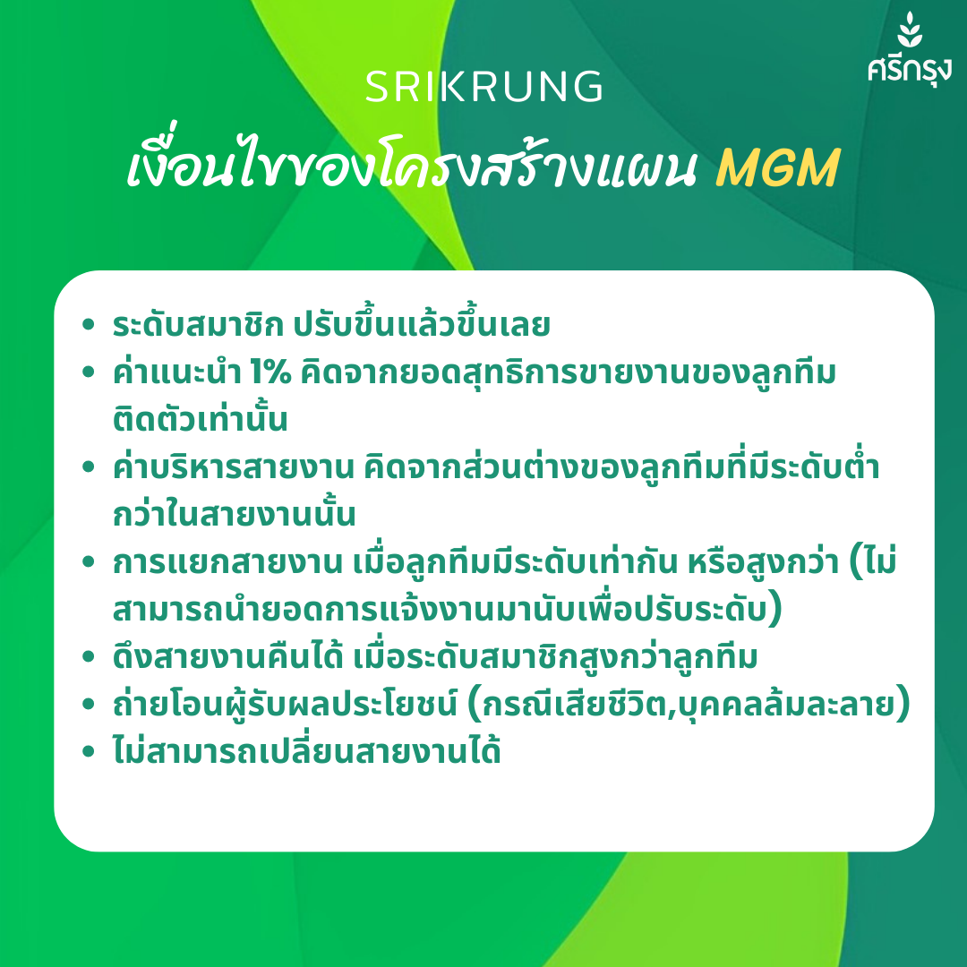 พอพูดถึงเงื่อนไขนี้ ไม่สามารถเปลี่ยนสายงานได้เชื่อว่าต้องมีคนลังเลไม่อยากจะทำบ้างแหละ แต่รู้มั้ยครับว่ามันคือคีย์สำคัญที่ทำให้ระบบ MGM ของศรีกรุงโบรคเกอร์สามารถสร้าง Passive Income ให้กับเราได้จริง