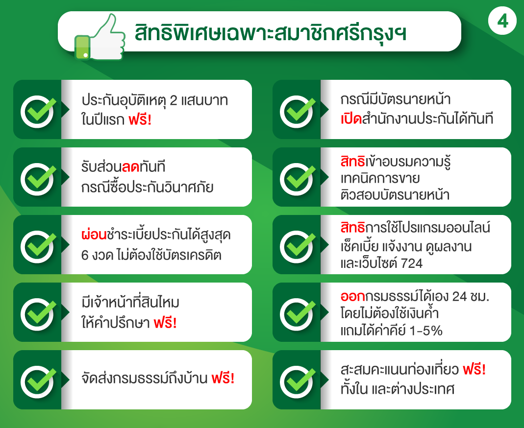 - รับฟรี ประกันอุบัติเหตุส่วนบุคคลทุน 1 แสน บาท ความคุ้มครอง 1 ปี หลังจากสมัครสมาชิก