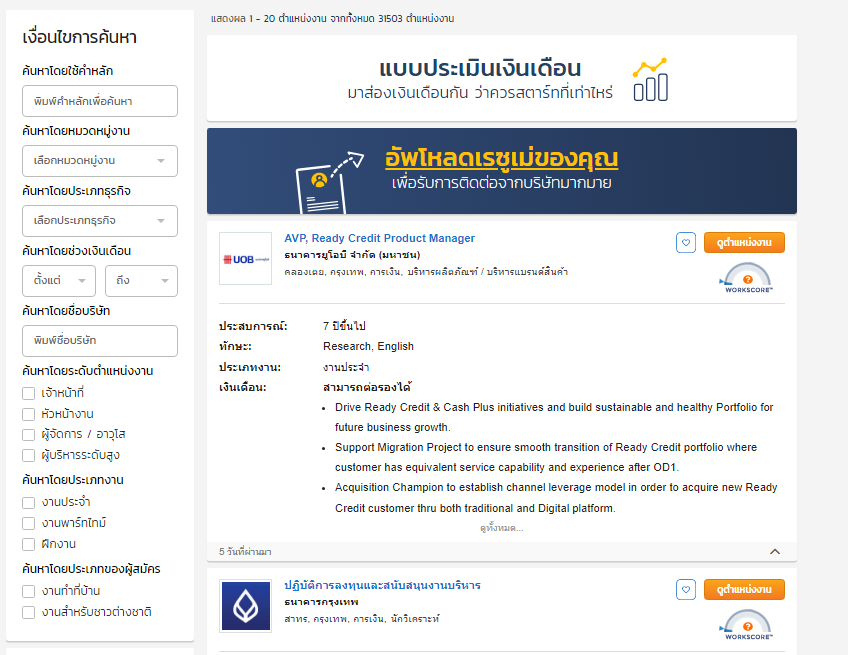 สำหรับคนที่มาหางาน กดไปที่ "ดูตำแหน่งงานทั้งหมด" จะมีตัวกรองเพิ่มเติมให้ เช่น หมวดหมู่งาน ประเภทธุรกิจ ช่วงเงินเดือน ชื่อบริษัท ระดับตำแหน่งงาน ประเภทงาน