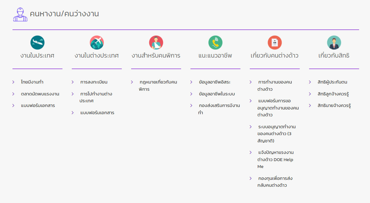 - เกี่ยวกับคนต่างด้าว " แนะนำการทำงาน แบบฟอร์มขออนุญาตทำงาน ระบบแจ้งปัญหาแรงงาน และกองทุนเพื่อการส่งกลับ "