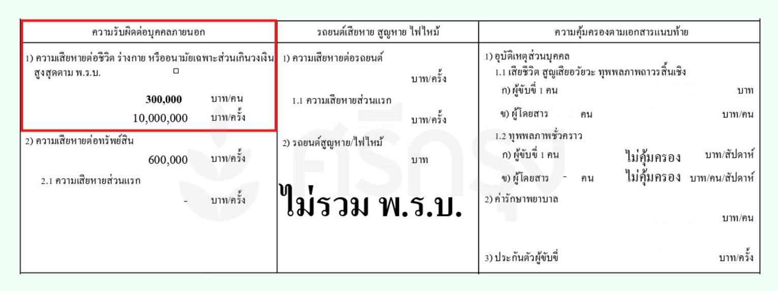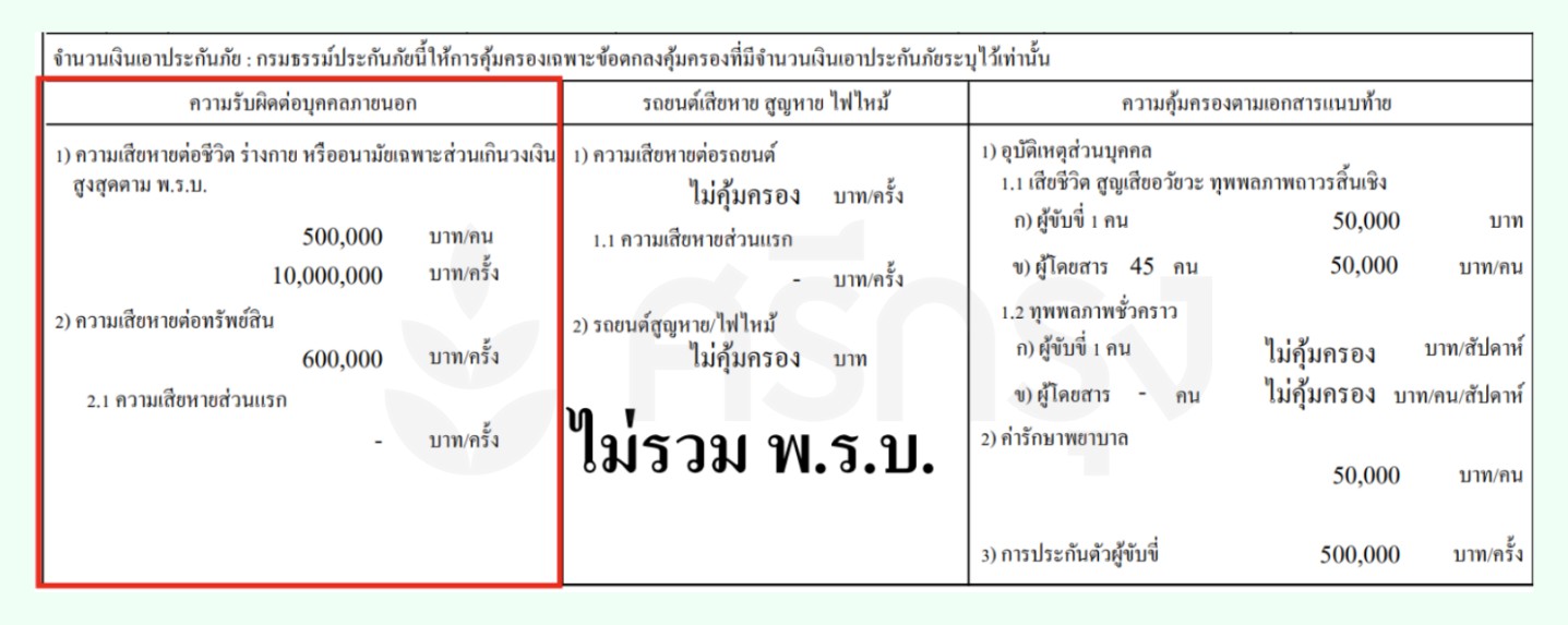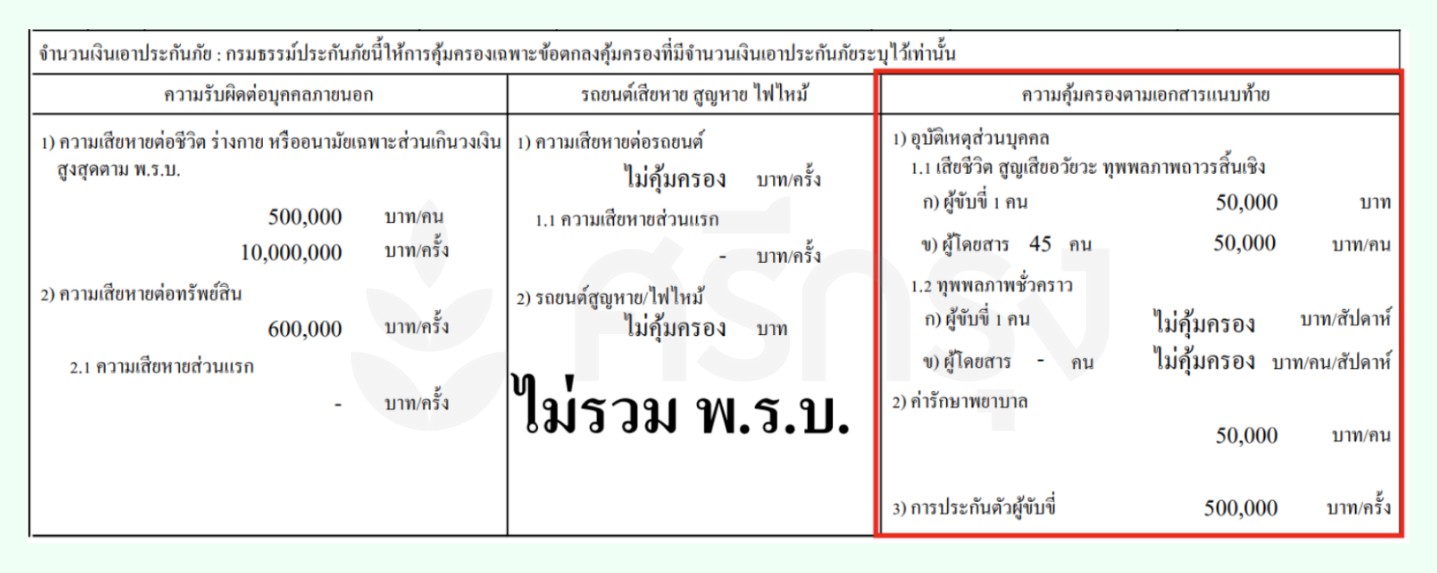 รถบัสดังกล่าวมีประกันภัยรถยนต์ภาคสมัครใจประเภท 3 กับบริษัท มิตรแท้ประกันภัย จำกัด (มหาชน) โดยให้ความคุ้มครองดังนี้: